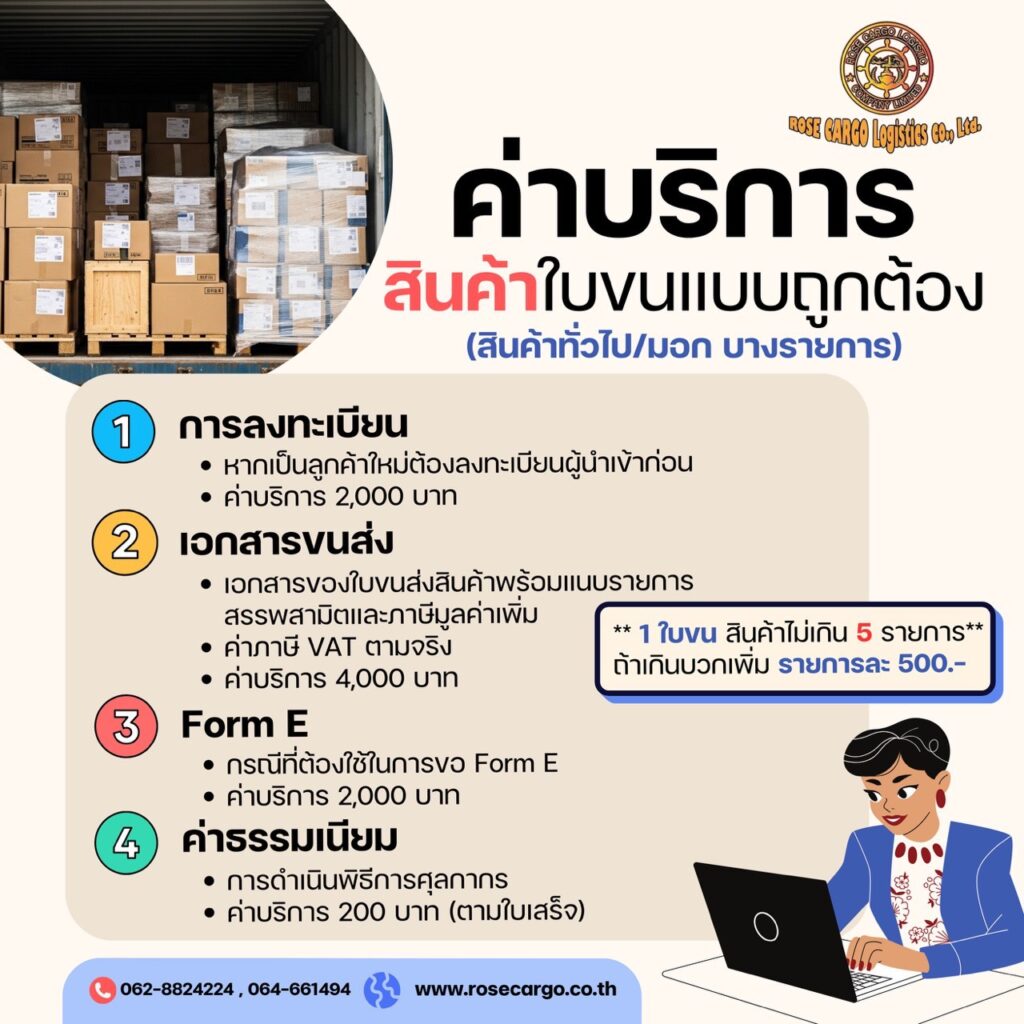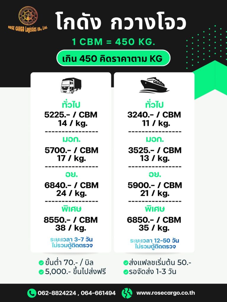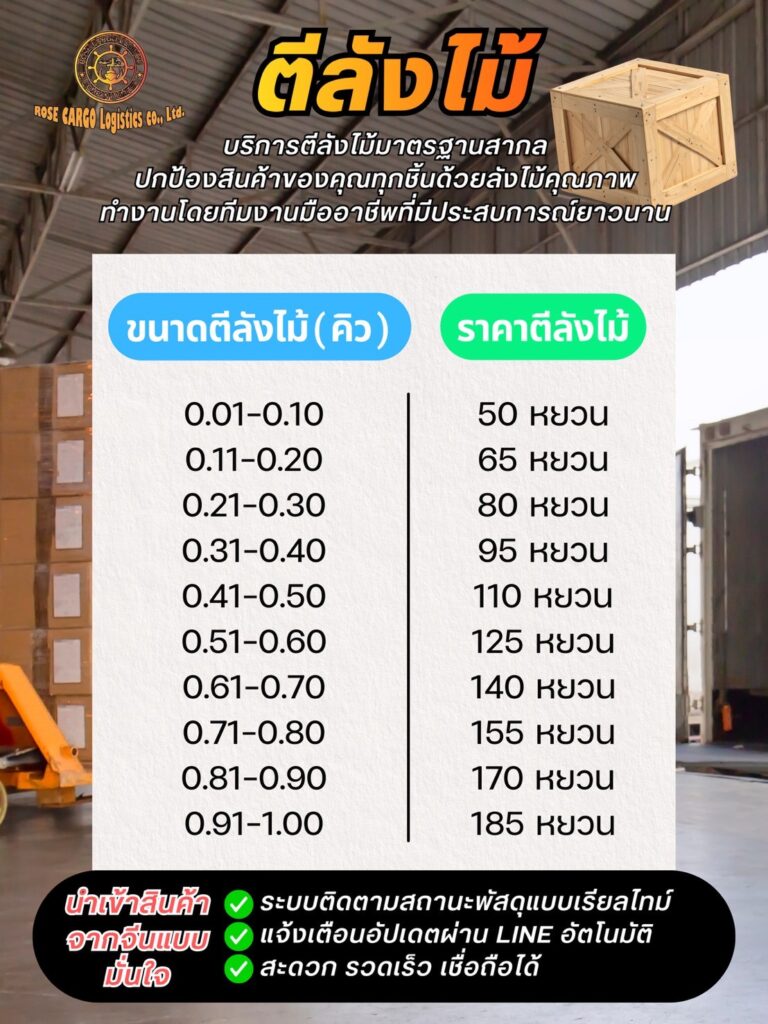| ประเภทสินค้า | คิดตามขนาด (บาท/คิว) | คิดตามน้ำหนัก (บาท/กิโลฯ) |